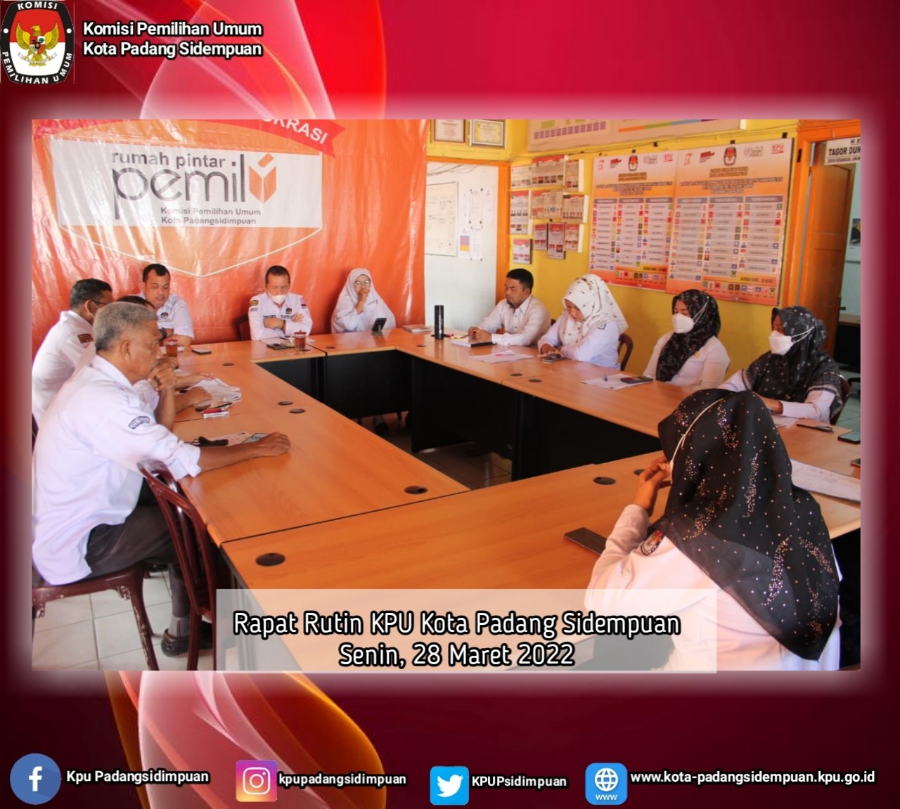 Rapat rutin KPU Kota Padang Sidempuan yang dihadiri oleh seluruh Komisioner, Sekretaris, Para Kasubbag dan Staf Sekretariat KPU Kota Padang Sidempuan dengan agenda Peningkatan Displin Kerja Dalam Rangka Menyambut Bulan Suci Ramdhan di Lingkungan Komisi Pemilihan Umum Kota Padang Sidempuan.
