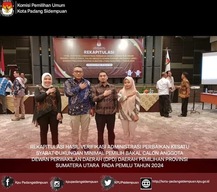 #TemanPemilih, Ketua Divisi Teknis Penyelenggaraan (Fadlyka Himmah Syahputera Harahap), Ketua Divisi Hukum dan Pengawasan (Ahmad Rasid), Kasubbag Teknis Penyelenggara Pemilu (Annur Rasyidah Siregar) beserta Operator Silon (Maimunah) mengikuti acara "Rekapitulasi Hasil Verifikasi Administrasi Perbaikan Kesatu Syarat Dukungan Minimal Pemilih Bakal Calon Anggota Dewan Perwakilan Daerah (DPD) Daerah Pemilihan Provinsi Sumatera Utara Pada Pemilu Tahun 2024" yang dilaksanakan di Le Polonia Hotel Medan, 04 Februari 2023.