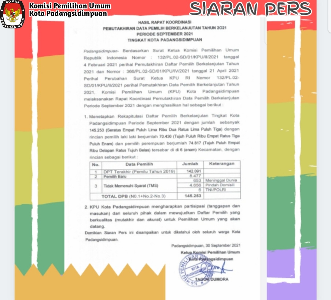 BERIKUT INI SIARAN PERS PENGUMUMAN DATA PEMILIH BERKELANJUTAN (DPB) PERIODE SEPTEMBER 2021: