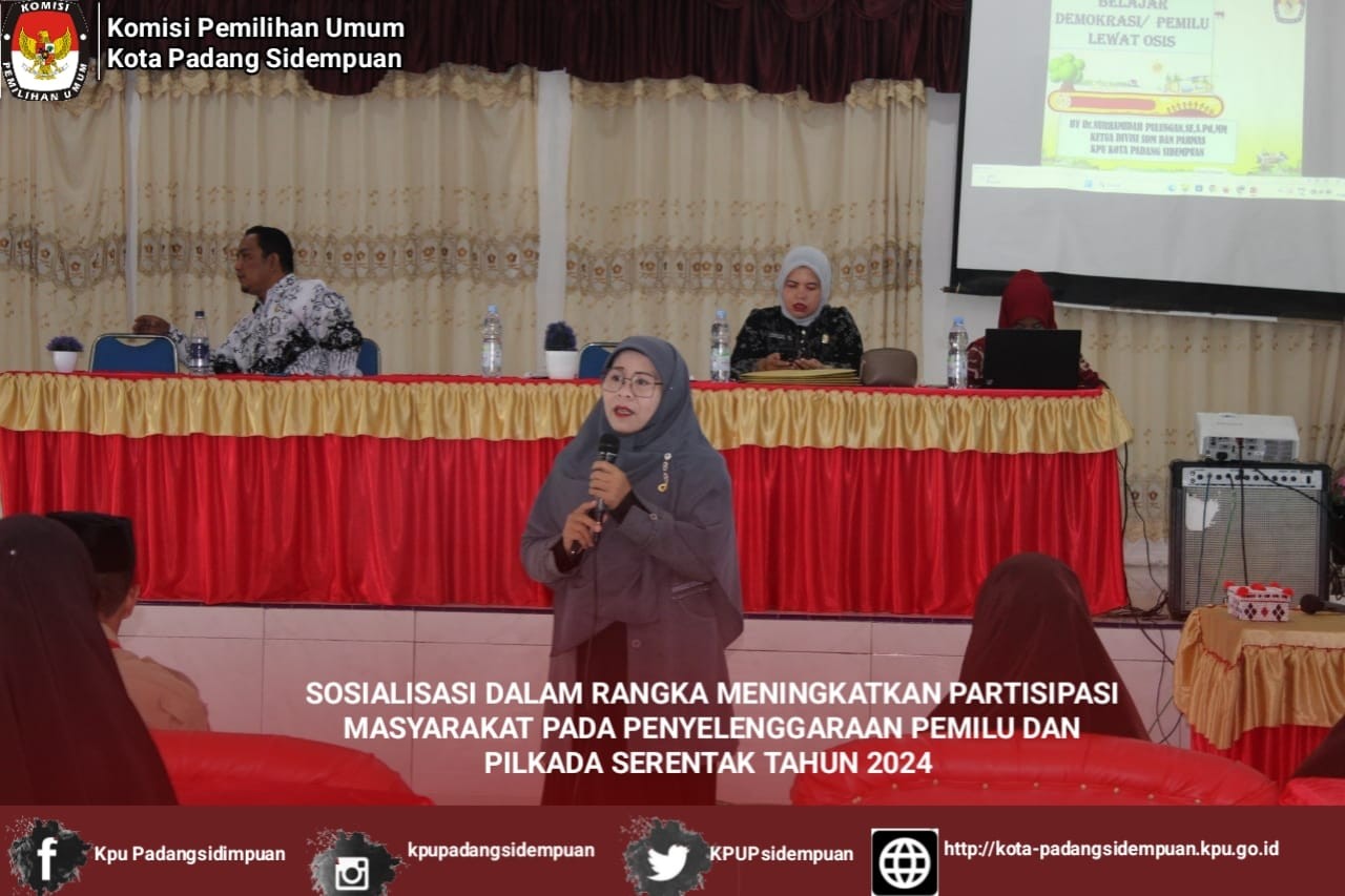 Dalam pelaksanaan kegiatan ini Anggota KPU Kota Padangsidimpuan selaku Ketua Divisi Sosialiasi, Pendidikan Pemilih, Partisipasi Masyarakat dan SDM Nurhamidah Pulungan memaparkan dan menjelaskan Tahapan Pelaksanaan Pemilu, syarat memilih, Peranan Pemilih dan materi kepemiluan lainnya dalam Menyongsong Pemilu Serentak Tahun 2024 Yang Berintegritas, selanjutnya mengajak para peserta yang hadir untuk dapat menjadi duta KPU dalam mensosialisaikan dan juga mengajak orang tua, saudara dan family lainnya untuk menjadi pemilih cerdas serta berperan dalam mensukseskan Pemilu Tahun 2024 dengan cara datang ke TPS masing-masing dengan memberikan hak suaranya.
