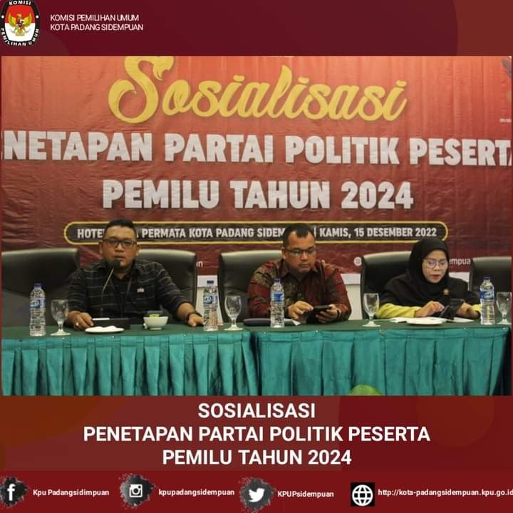 Komisioner KPU Padang Sidempuan Ketua Divisi Teknis Penyelenggaraan, Fadlyka Himmah Syahputera Harahap dalam sosialisasi tersebut sebelum membacakan Surat keputusan Ketua KPU RI No. 518 Tahun 2022 tentang Penetapan Partai Politik Peserta Pemilu Tahun 2024 menjelaskan Parpol peserta Pemilu Serentak Tahun 2024 sebagaimana tertuang dalam Keputusan KPU RI No.518 Tahun 2022 terdiri dari
