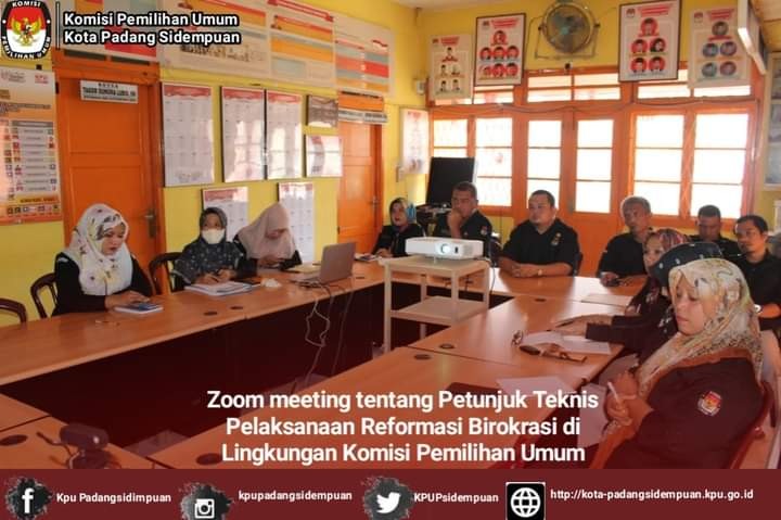 Sekretaris KPU Kota Padang Sidempuan beserta seluruh Kasubbag KPU Kota Padang Sidempuan mengikuti Sosialisasi Reformasi Birokrasi yang dilaksanakan oleh KPU Provinsi Sumatera Utara pada hari Rabu, 22 Juni 2022 melalui media Zoom Meeting .