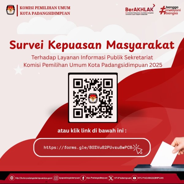 Dalam rangka pelaksanaan Survei Kepuasan Masyarakat terhadap Layanan Informasi Publik di lingkungan Sekretariat KPU Kota Padangsidimpuan Tahun 2025, kami mohon kesediaan Bapak/Ibu untuk meluangkan waktu sejenak guna mengisi kuesioner pada tautan di bawah atau scan pada barcode diatas.