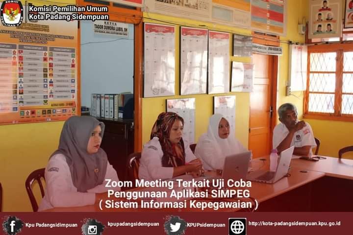 #TemanPemilih, Sekretaris KPU Kota Padang Sidempuan Deka Ria Murti Lubis, SH didampingi Kasubbag Hukum dan SDM KPU Kota Padang Sidempuan Sahlan Basri, SH bersama staf Kasubbag Hukum dan SDM saudari Sriani dan staf Kasubbag Umum saudari Elida Gusti mengikuti zoom meeting terkait " Uji Coba Penggunaan Aplikasi SIMPEG ( Sistem Informasi Kepegawaian ) " yang diselenggarakan oleh KPU RI pada hari Kamis, 7 Juli 2022 Pukul 09 : 00 WIB