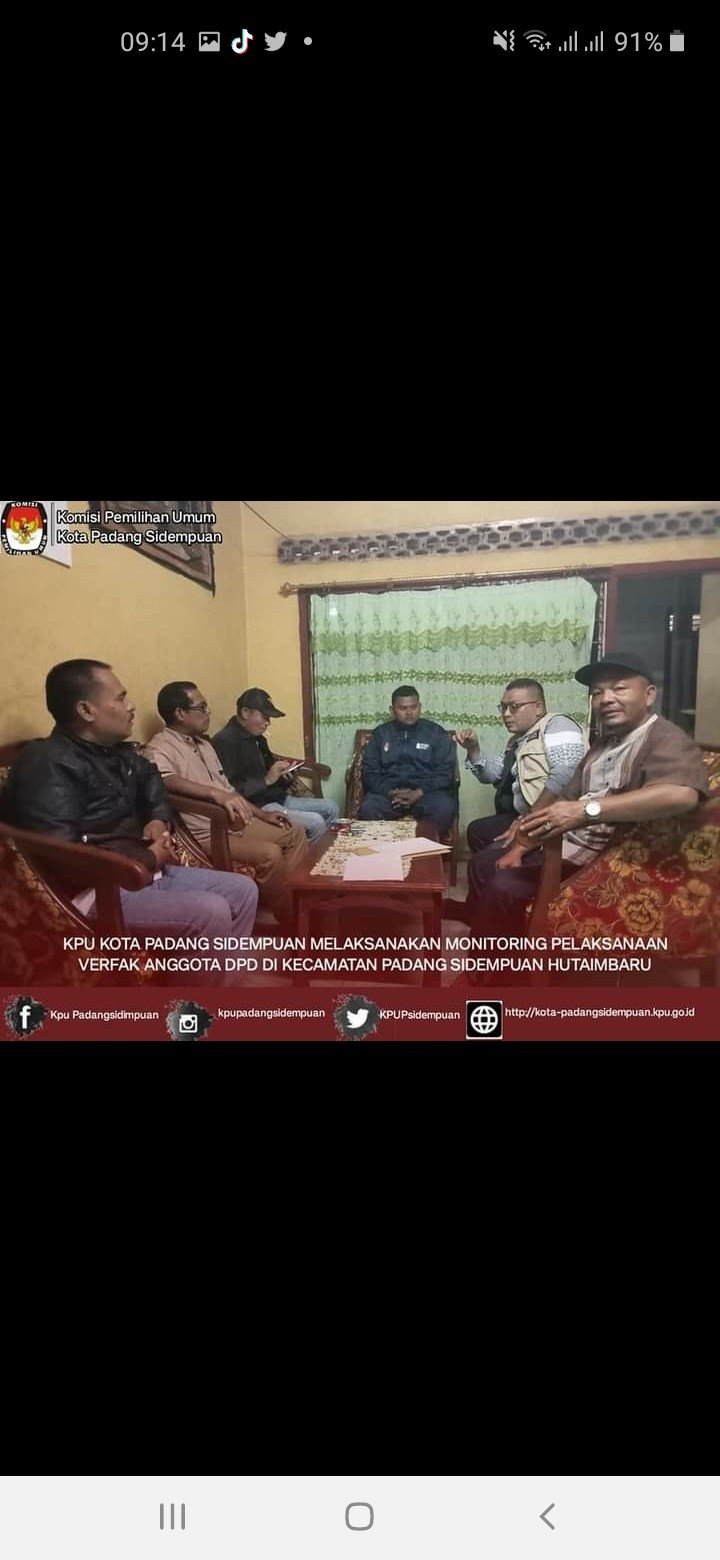 #TemanPemilih, KPU Kota Padang Sidempuan menyerahkan lembar kerja dan melakukan monitoring pelaksanaan Verifikasi Faktual Syarat Dukungan Minimal Pemilih Bakal Calon Anggota DPD Daerah Pemilihan Provinsi Sumatera Utara Pada Pemilu Tahun 2024 di Kecamatan Padang Sidempuan Hutaimbaru didampingi oleh Pengawas Kelurahan/Desa (PKD) wilayah kerja masing-masing.